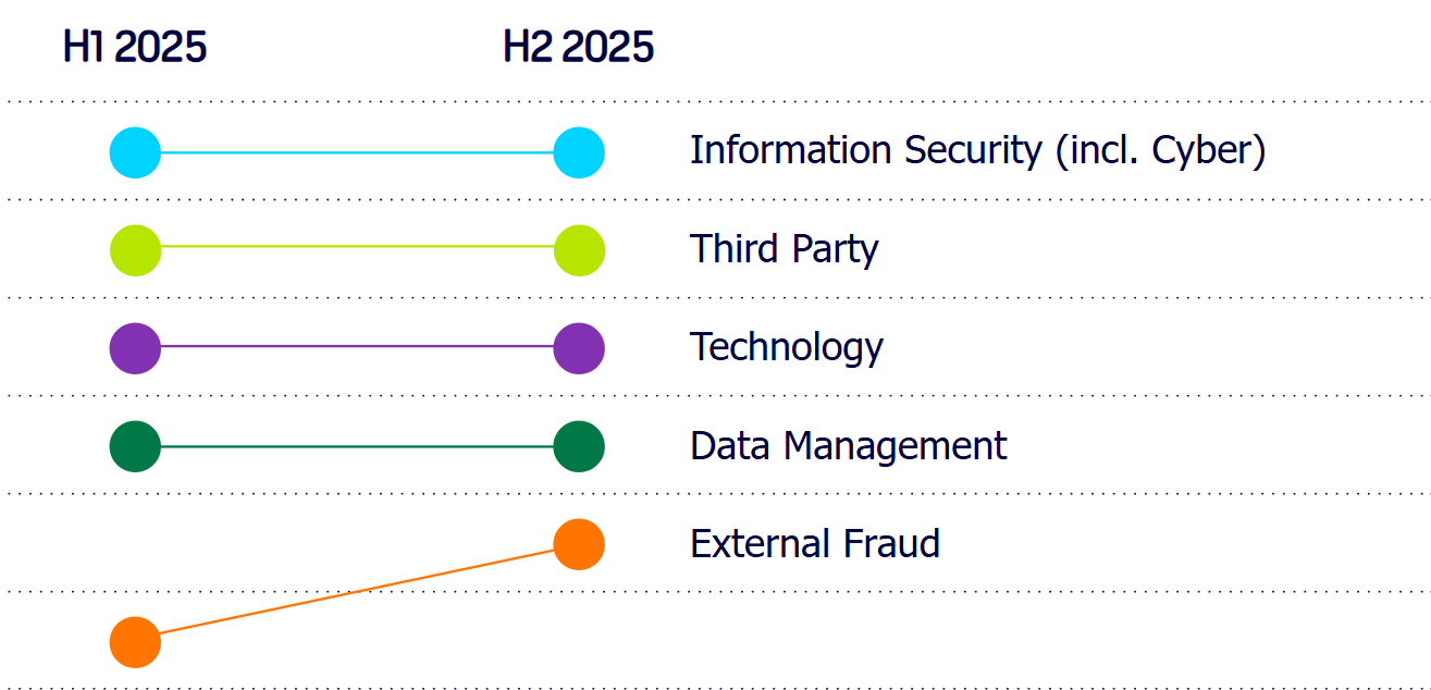 Like External Fraud, Business Continuity has moved up a place since H1, and up two rankings year on year. Survey respondents recognise that strengthening operational resilience must extend beyond business continuity management, in response to complex digital infrastructures, disruptive cyber attacks, physical climate events and geopolitically motivated attacks.